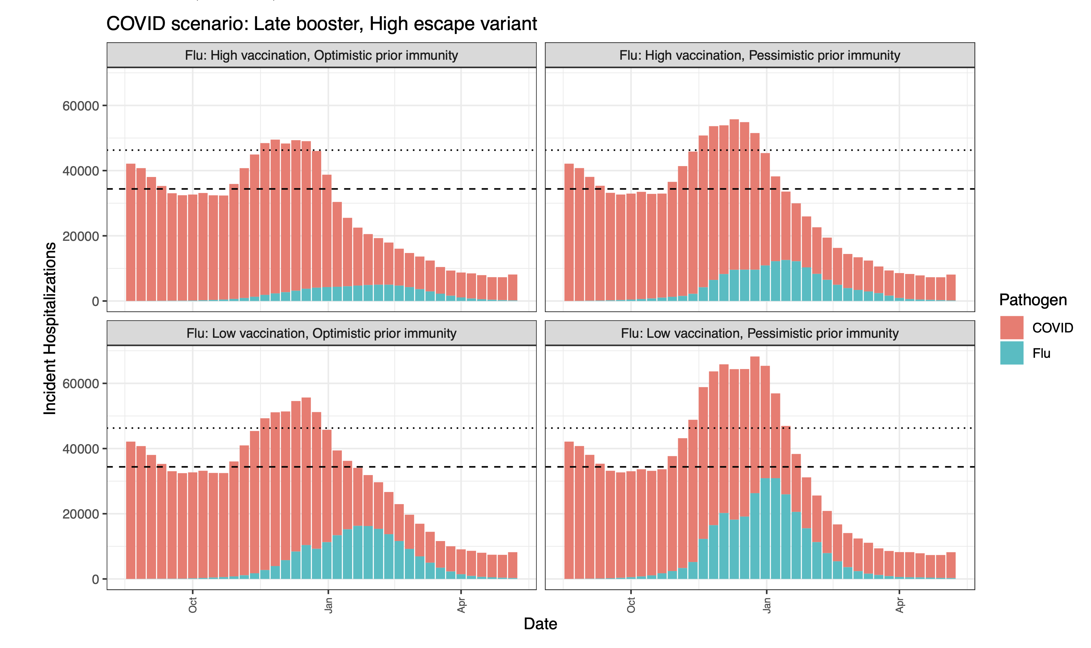 Combining COVID-19 and influenza hospitalization projections, we find that while there is substantial variability among the combinations of the various scenarios, in each combination, we expect to see a substantial burden on the healthcare system. In particular, with the most pessimistic COVID-19 scenario (i.e., a new SARS-CoV-2 variant with late boosters) combined with all scenarios of influenza, hospitalizations are projected to exceed the highest levels of weekly incident hospitalizations observed since the first Omicron surge (n=46,000 in July 2022). In the most pessimistic combination of scenarios, we project 68,000 peak hospitalizations (median ensemble estimates).