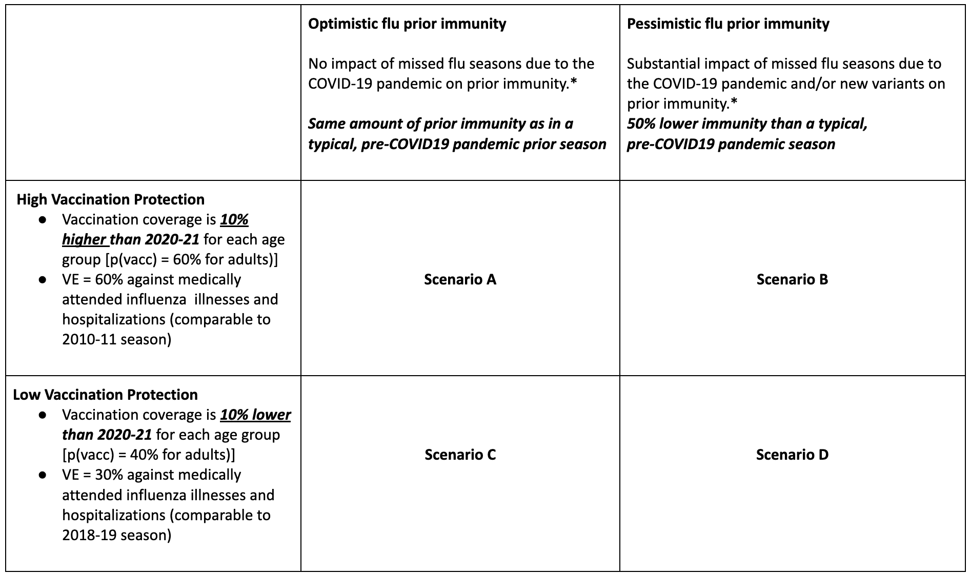 Table 1. Flu Scenario Modeling Hub round 1 scenarios. More detailed scenario definitions and model characteristics can be found at https://github.com/midas-network/flu-scenario-modeling-hub.