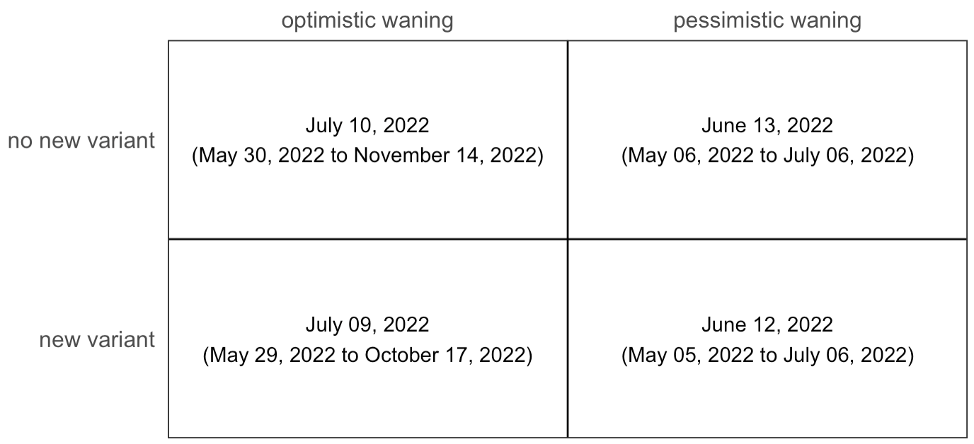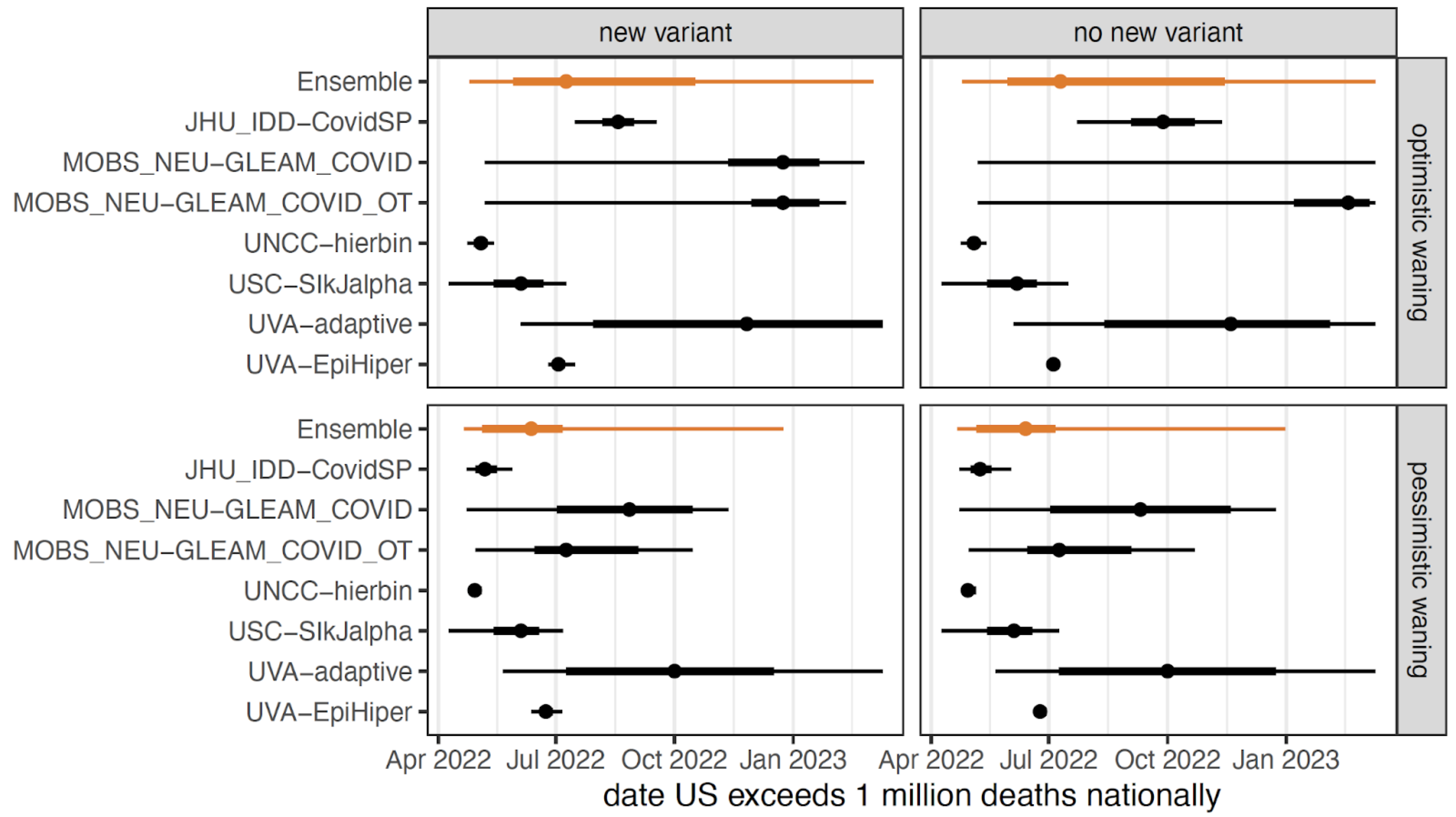 The emergence of a new variant or other unforeseen event could accelerate this timeline. While it is impossible to know what the properties and timing of such a variant would be, in this round the COVID-19 Scenario Modeling Hub did consider scenarios where a hypothetical variant with moderate immune escape emerged and started circulating in the United States on May 1, 2022. While the considered hypothetical variant did not substantially impact the earliest or most likely time we might see deaths cross 1 million, it did make a longer wait until this milestone less plausible.