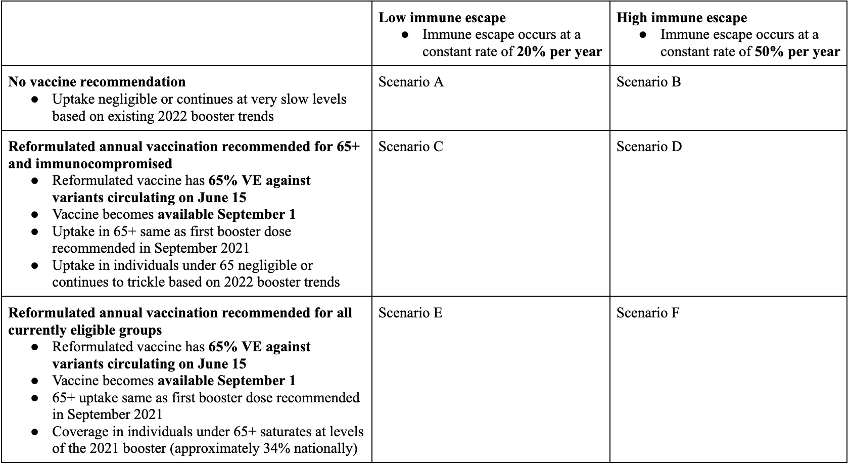 Table 1. COVID-19 Scenario Modeling Hub round 18 scenarios. More detailed scenario definitions and model characteristics can be found at https://github.com/midas-network/covid19-scenario-modeling-hub.