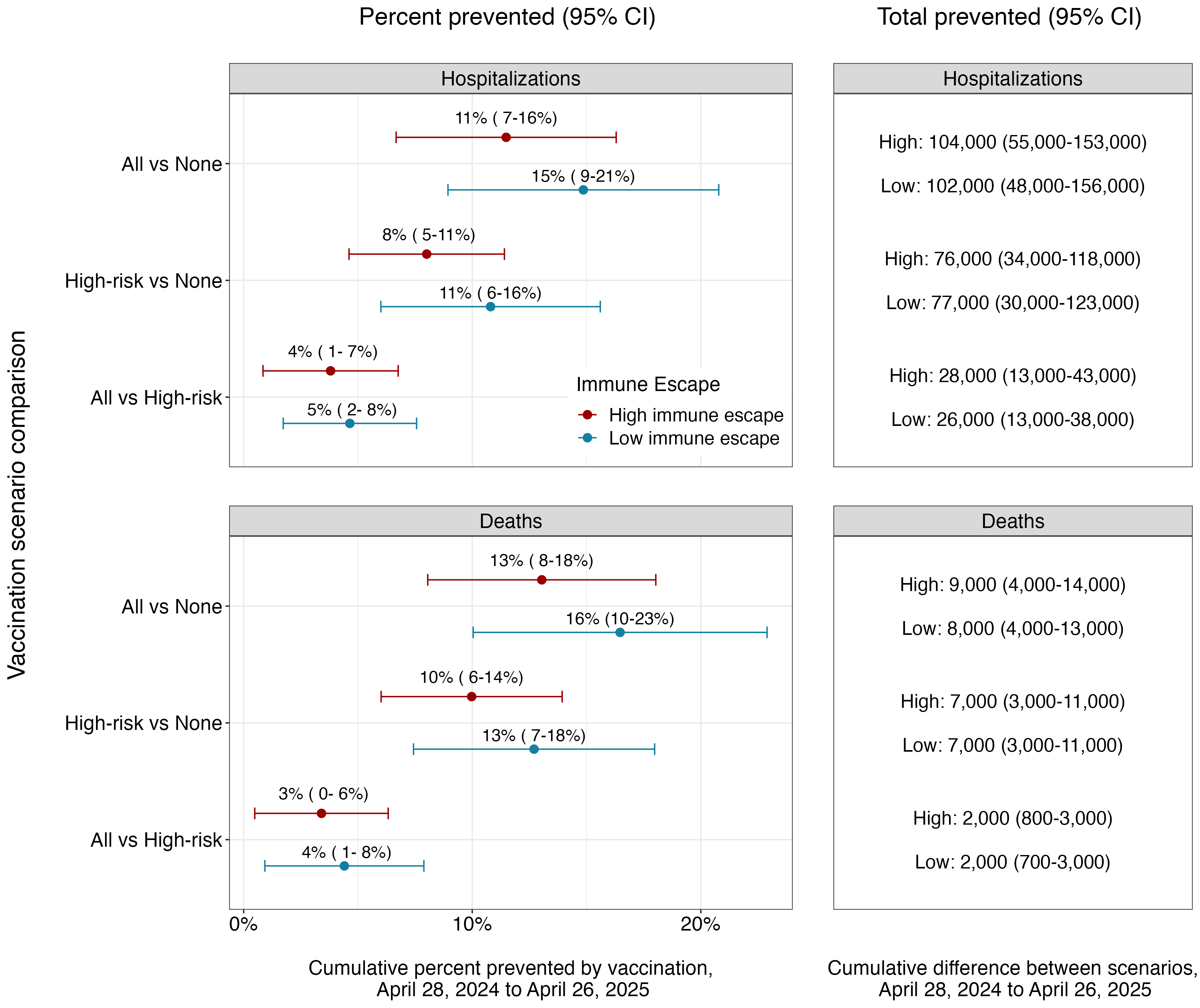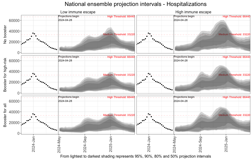 In a new round of projections, the Scenario Modeling Hub evaluated the trajectory of COVID-19 during April 28, 2024 to April 26, 2025 (52-week horizon), under 6 scenarios about the extent of immune escape of circulating variants (50% vs 20% annually) and the annual uptake of reformulated boosters (i) minimal uptake, ii) high-risk group uptake, where vaccination is recommended for individuals under 65 yrs with high-risk conditions and those over 65 yrs, with vaccination coverage mirroring reported levels in these groups in 2023-24, or iii) universal uptake corresponding to 2023-24 coverage levels in the entire US population). Nine teams contributed both national and state-specific projections.